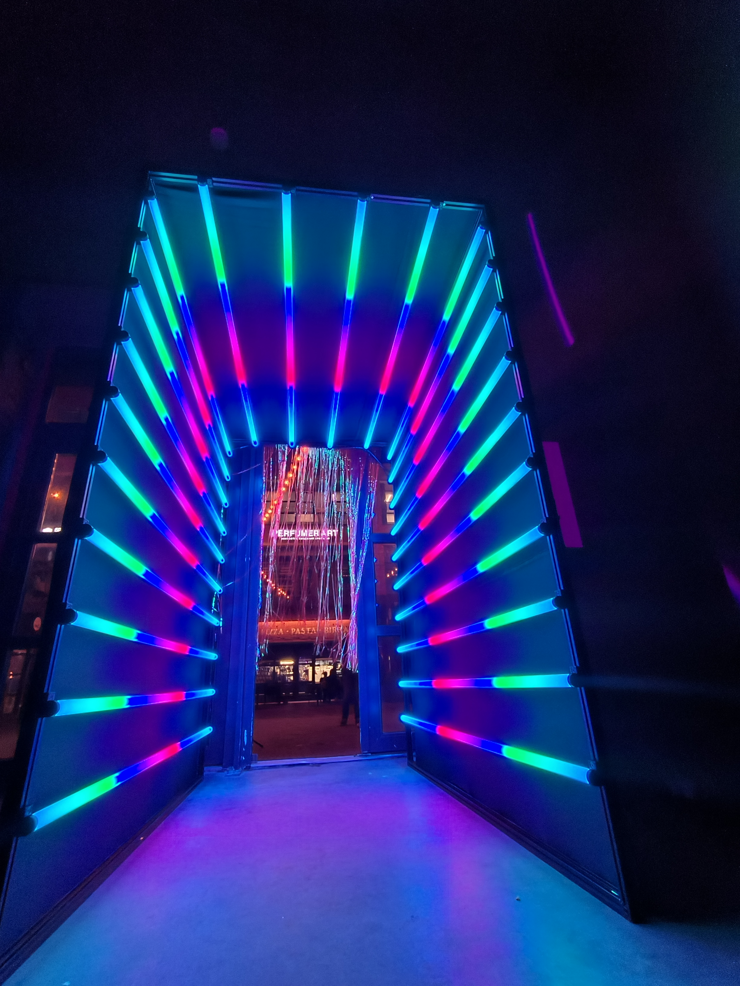 Неоновый тоннель так же можно использовать в качестве необычного входа на мероприятие, создающий wow-эффект. У нас два тоннеля, можем собрать коридор из двух тоннелей. На фото варианты с одним и двумя тоннелями.